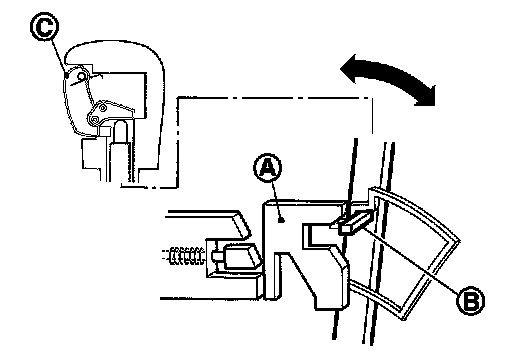 The position pin (B) enters the "P" position thrusting away the lock plate when the selector lever is shifted to the "P" position. Then, the shift mechanism is locked when the selector button (C) is released.