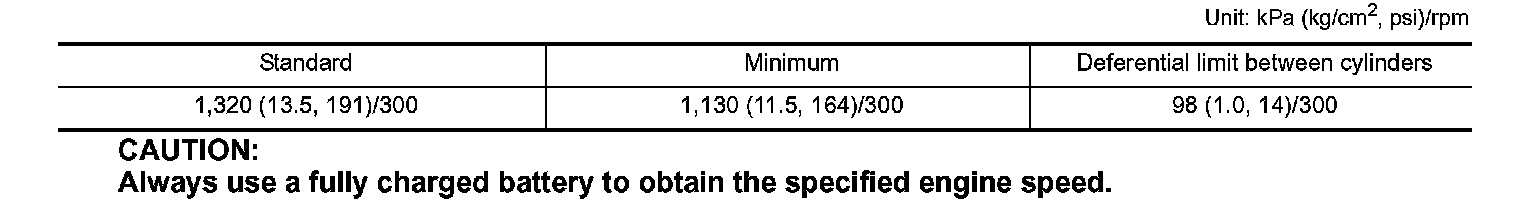 - If compression pressure is below minimum value, check valve clearances and parts associated with combustion chamber (valve, valve seat, piston, piston ring, cylinder bore, cylinder head, cylinder head gasket). After the checking, measure compression pressure again.