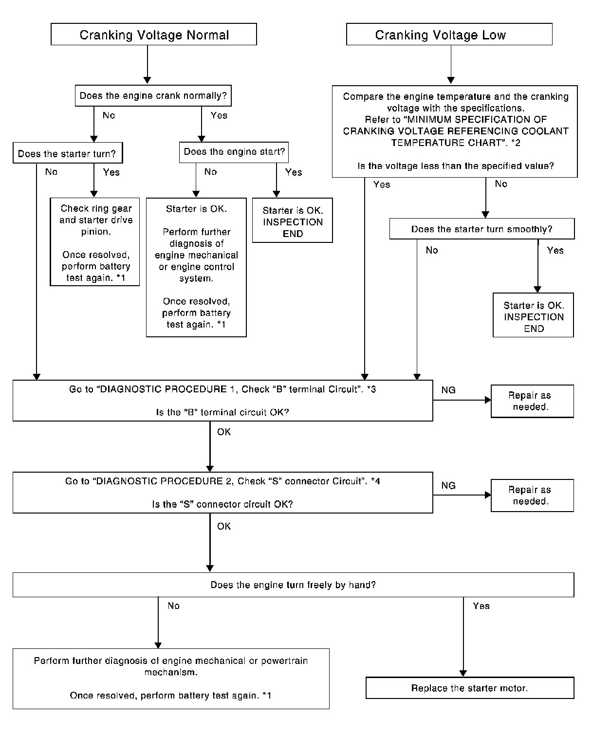 NG - Check harness between the battery and the starter motor for poor continuity.