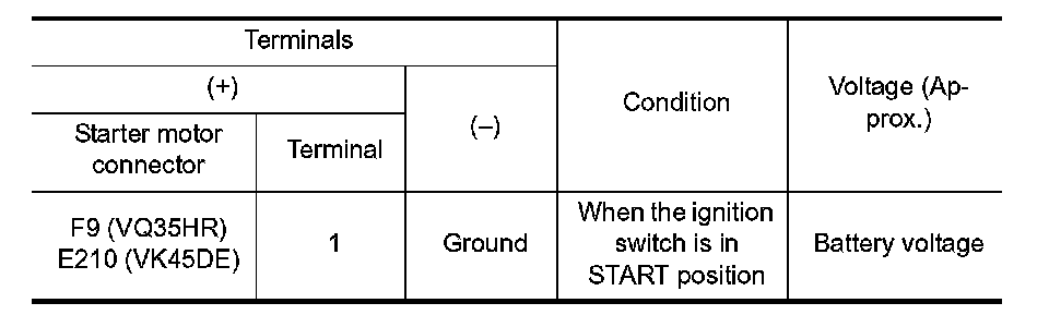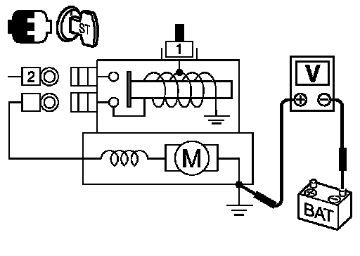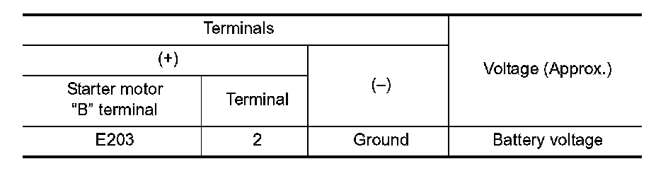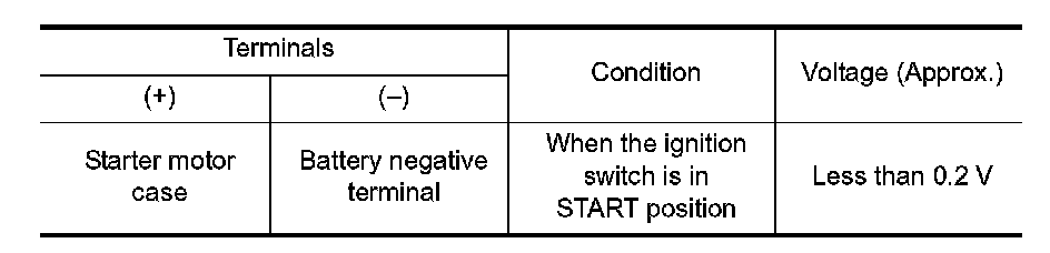 2. Check voltage between starter motor case and battery negative terminal.