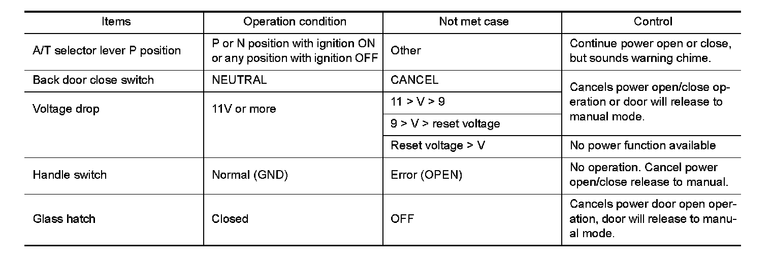 - The back door control units checks back door close switch (terminal 13) status and door position (must be fully opened), through rotary encoder and battery voltage.