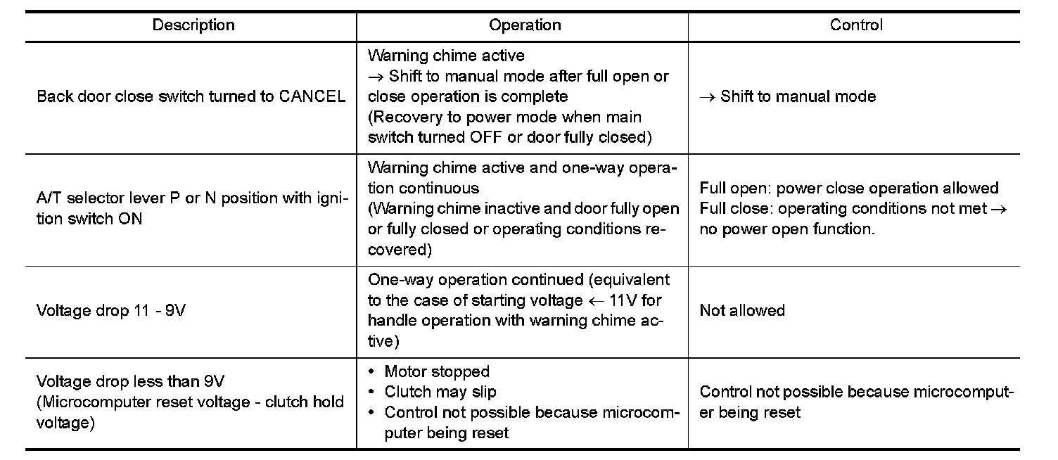 - When the back door latch operates and full close is detected through terminal 14 of the back door control unit, the cinch latch motor reverses to the neutral position and the back door auto closure operation ends and the door is fully closed.