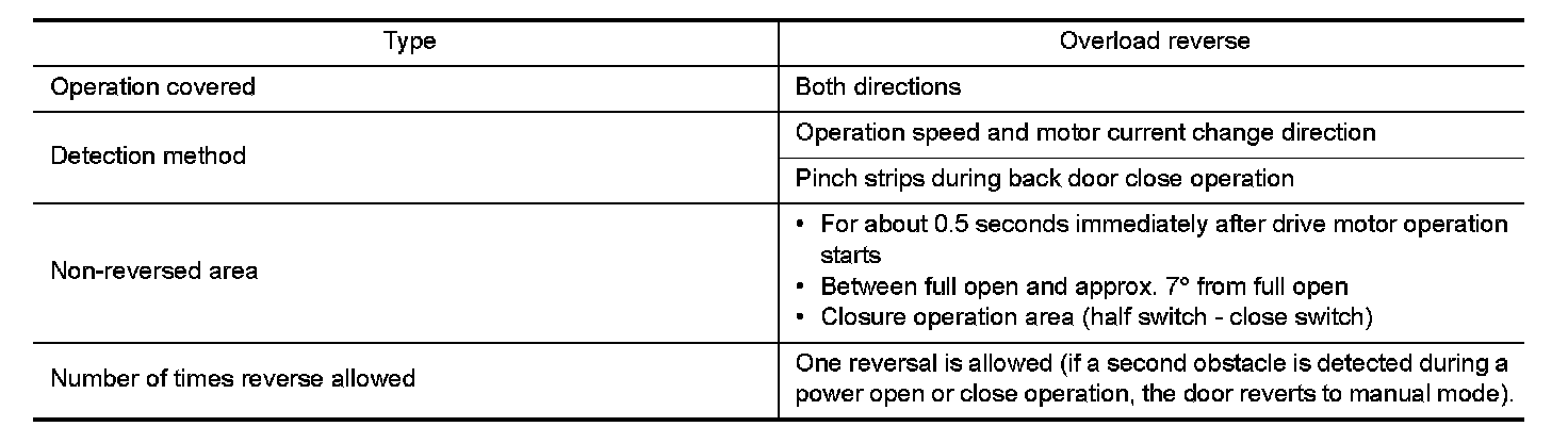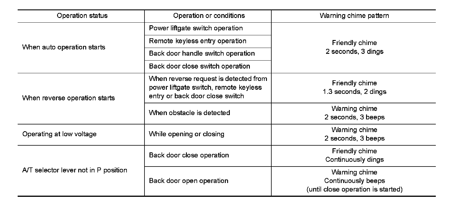 - During auto close operation, if an object is detected by the pinch strips in the door's path, a warning chime sounds and the back door operates in the open direction until it is fully open.
