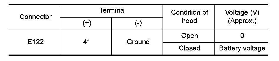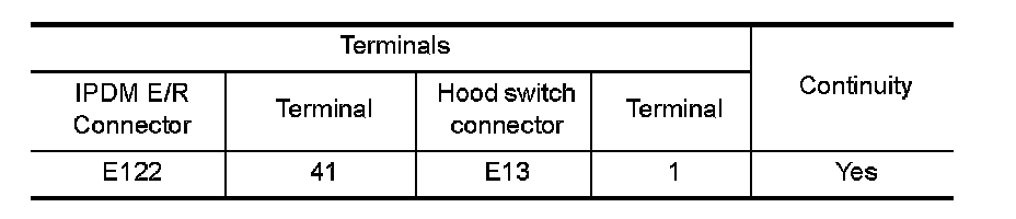 3. Check continuity between IPDM E/R connector (A) E122 terminal 41 and hood switch connector (B) E13 terminal 1.