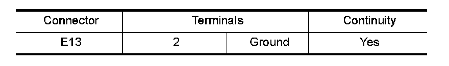 Check continuity between hood switch connector E13 terminal 2 and ground.