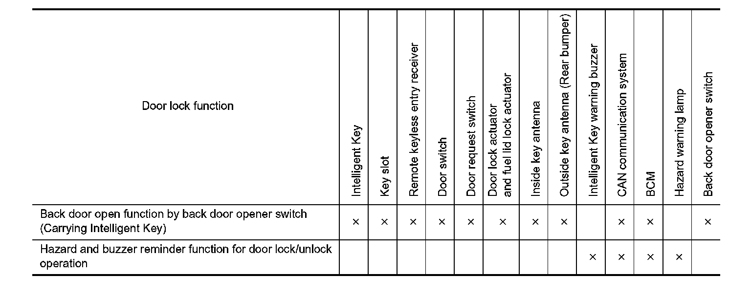 - The back door opener function can open the back door by pressing the back door opener switch while carrying the Intelligent Key. At this time, all doors other than the back door and fuel lid are locked.