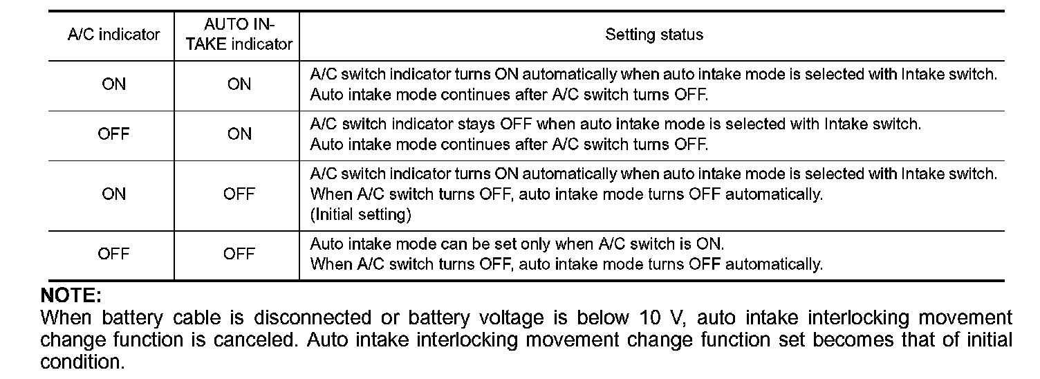 When battery cable is disconnected or battery voltage is below 10 V, auto intake interlocking movement change function is canceled. Auto intake interlocking movement change function set becomes that of initial condition.