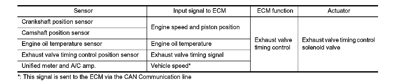 The ECM receives signals such as crankshaft position, camshaft position, engine speed, and engine oil temperature. Then, the ECM sends ON/OFF pulse duty signals to the exhaust valve timing control solenoid valve depending on driving status. This makes it possible to control the shut/open timing of the exhaust valve to increase engine torque and output in a range of high engine speed.