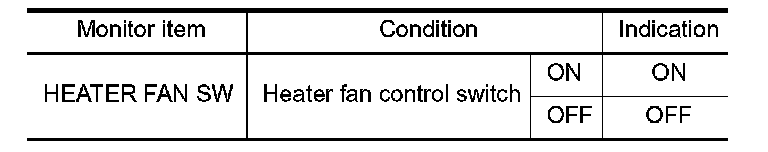 Select "HEATER FAN SW" and check indication under the following conditions.