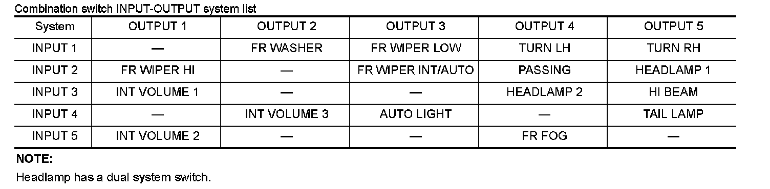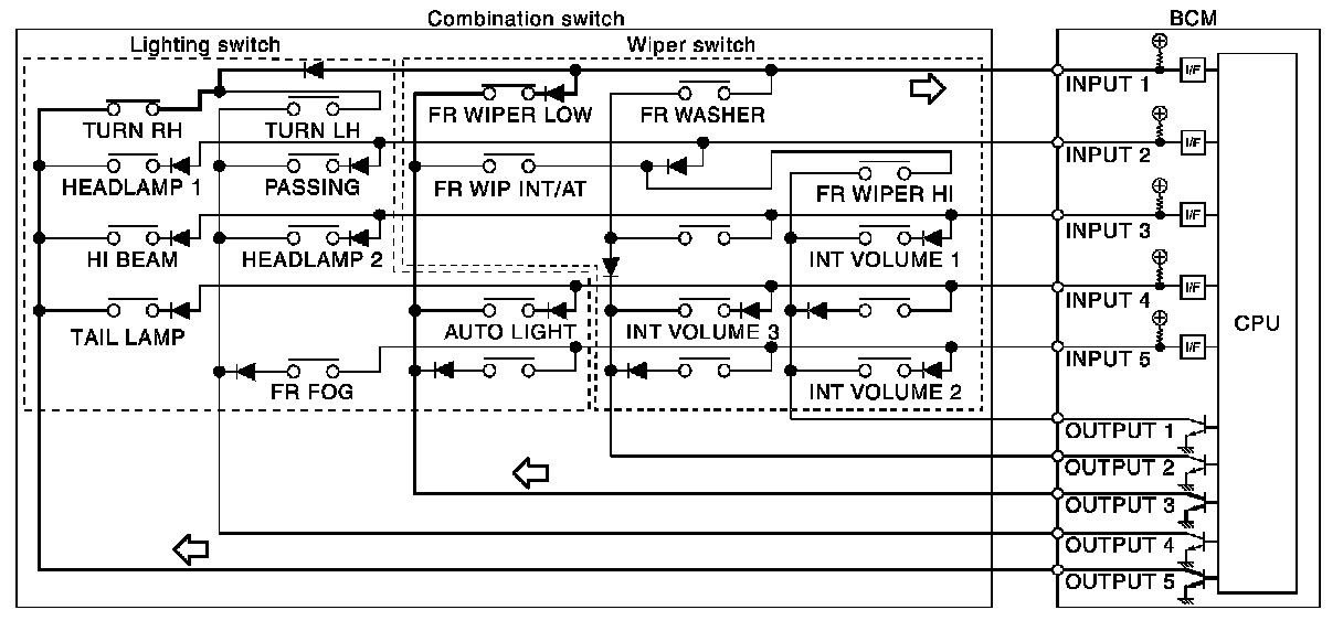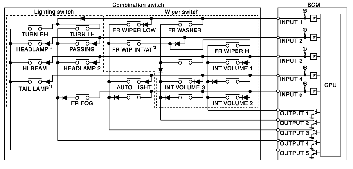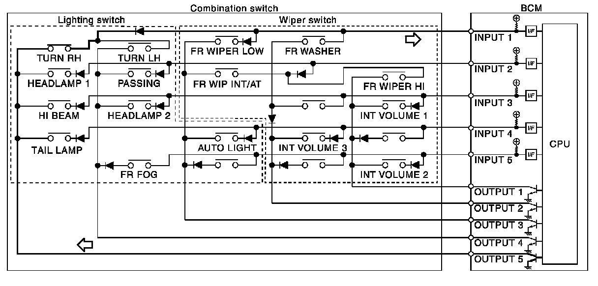 - BCM detects the combination switch status signal "1CE" when the signals of OUTPUT 3 and OUTPUT 5 are input to INPUT 1.