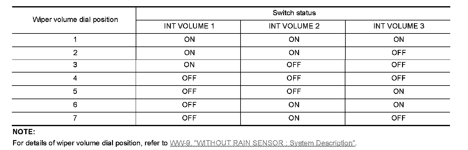 BCM judges the wiper volume dial 1 - 7 by the status of INT VOLUME 1, 2 and 3 switches.