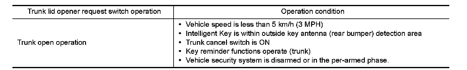 If the following conditions are not satisfied, trunk open operation is not performed even if the trunk lid opener request switch is operated.