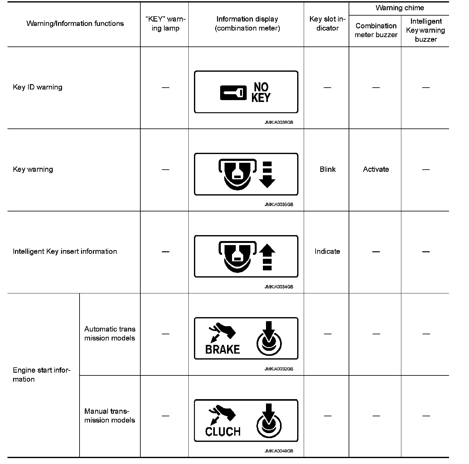 The warning function are as per the following items and are given to the user as warning information and warnings using combinations of Intelligent Key warning buzzer, KEY warning lamp, key slot indicator and information display in combination meter.