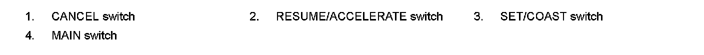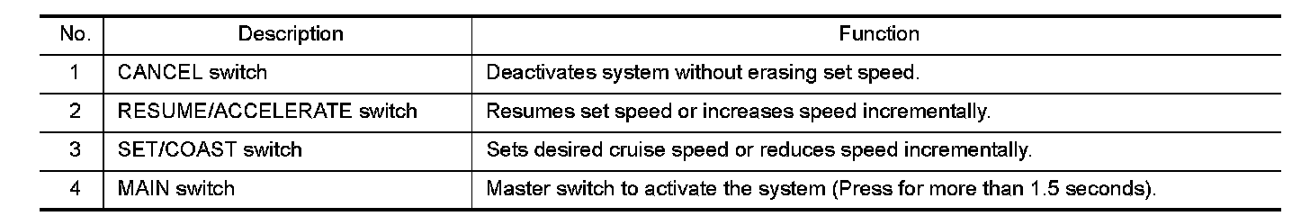 If the system is cancelled by conditions 1-5 below, the system will resume control at the last set cruising speed by pushing the RESUME/ACCELERATE switch.