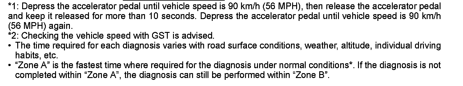 *1: Depress the accelerator pedal until vehicle speed is 90 km/h (56 MPH), then release the accelerator pedal and keep it released for more than 10 seconds. Depress the accelerator pedal until vehicle speed is 90 km/h
