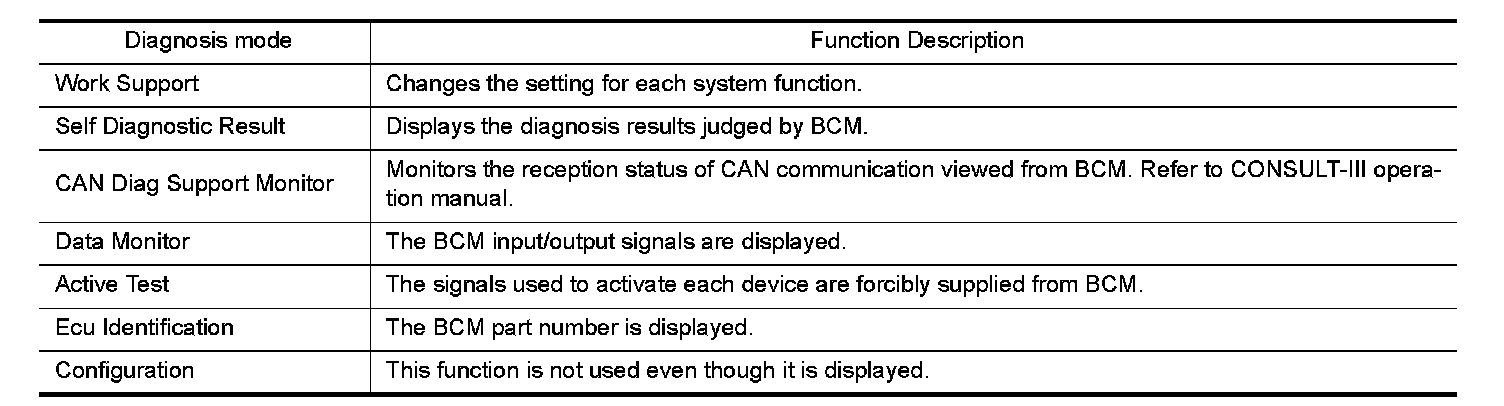 CONSULT-III performs the following functions via CAN communication with BCM.