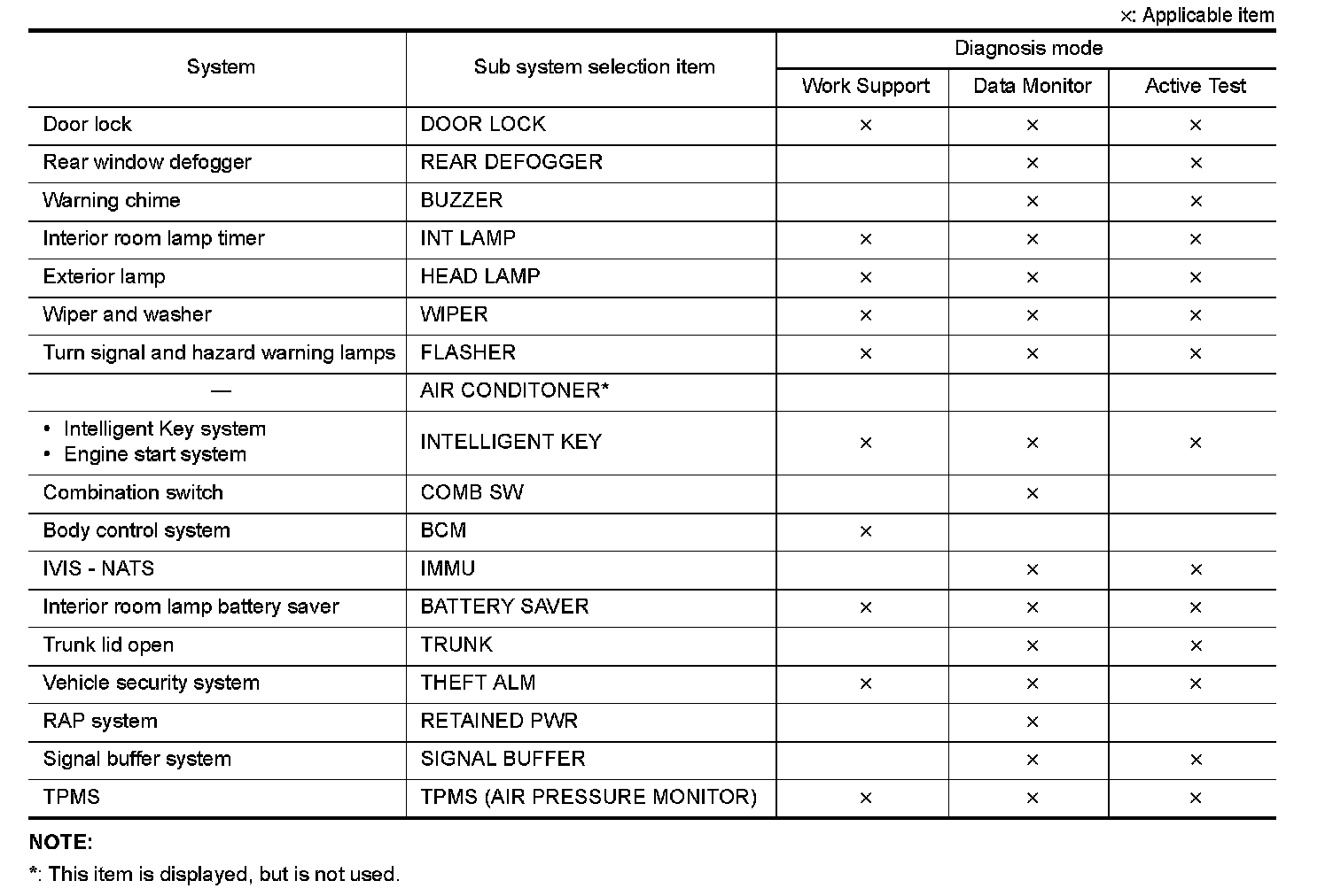 It can perform the diagnosis modes except the following for all sub system selection items.