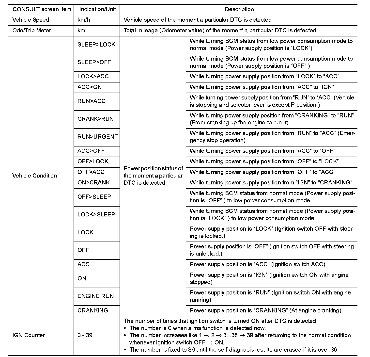 The BCM records the following vehicle condition at the time a particular DTC is detected, and displays on