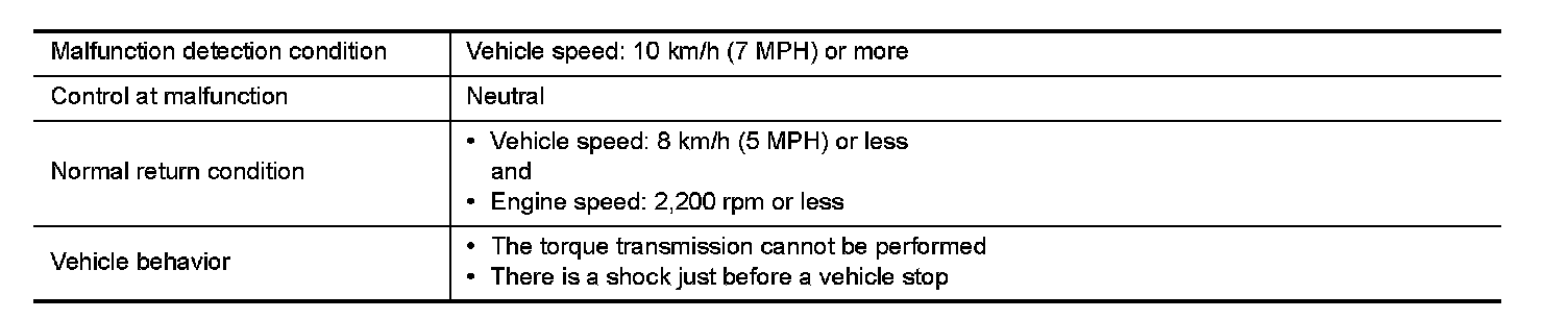 Intercepts the torque transmission and shift to the neutral status if the selector lever is shifted to "R" position while the vehicle moves forward at the vehicle speed 10 km/h (7 MPH) or more.