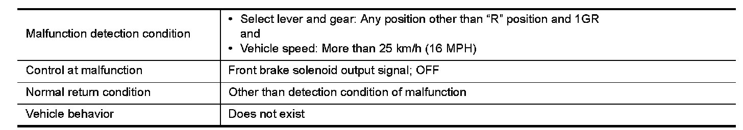 Controls the engine brake so as not to make effective by turning the front brake solenoid output to OFF when each solenoid becomes the electricity pattern of 1st engine brake during driving at the vehicle speed 25 km/h or more in any positions other than "R" position and 1GR.