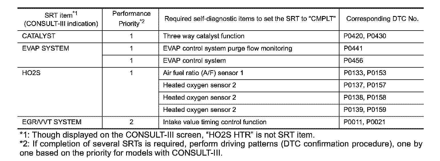 *2: If completion of several SRTs is required, perform driving patterns (DTC confirmation procedure), one by one based on the priority for models with CONSULT-III.