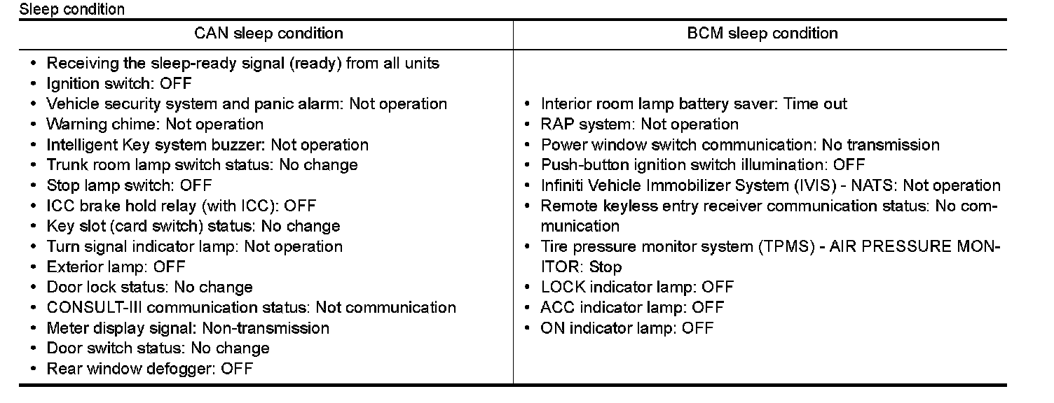 - BCM transmits the sleep wake up signal (sleep) to each unit when all of the CAN sleep conditions are fulfilled.