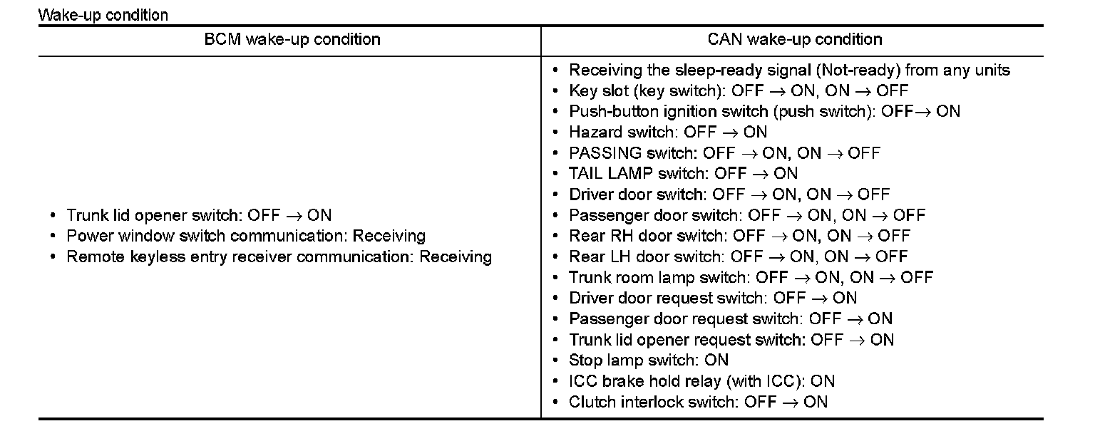 - BCM transmits the sleep wake up signal (wake up) to each unit when any of the CAN wake-up conditions is fulfilled. It changes from the low power consumption mode or the CAN communication sleep mode to the normal mode.