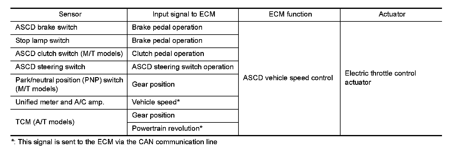 Operation status of ASCD is indicated by CRUISE indicator and SET indicator in combination meter. If any malfunction occurs in the ASCD system, it automatically deactivates control.