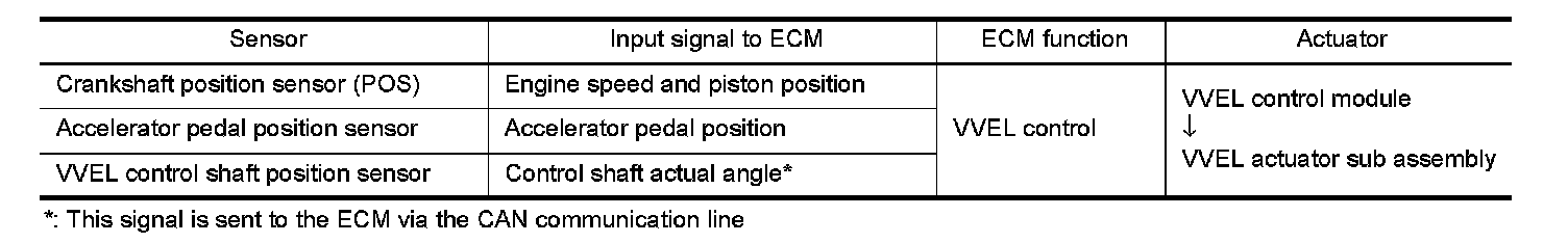 VVEL (Variable Valve Event & Lift) is a system that controls valve event and valve lift continuously. Rotational movement of the drive shaft equipped with eccentric cam is transmitted to output cam via the rocker arm and two kinds of links to depress the intake valve. ECM decides the target valve lift according to the driving condition and sends the command signal to the VVEL control module. The VVEL control module controls the rotation of the control shaft using the VVEL actuator motor and changes the movement of the output cam by shifting the link supporting point. As a result, valve lift changes continuously to improve engine output and response.