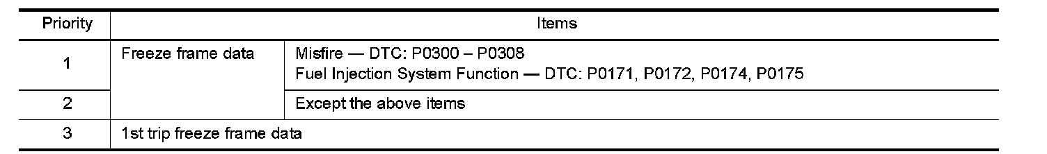 For example, the EGR malfunction (Priority: 2) was detected and the freeze frame data was saved in the 2nd trip. After that when the misfire (Priority: 1) is detected in another trip, the freeze frame data will be updated from the EGR malfunction to the misfire. The 1st trip freeze frame data is updated each time a different malfunction is detected. There is no priority for 1st trip freeze frame data. However, once freeze frame data is stored in the ECM memory, 1st trip freeze data is no longer stored (because only one freeze frame data or 1st trip freeze frame data can be stored in the ECM). If freeze frame data is stored in the ECM memory and freeze frame data with the same priority occurs later, the first (original) freeze frame data remains unchanged in the ECM memory.