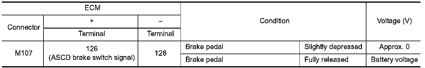 3. Check the continuity between ASCD brake switch terminals under the following conditions.