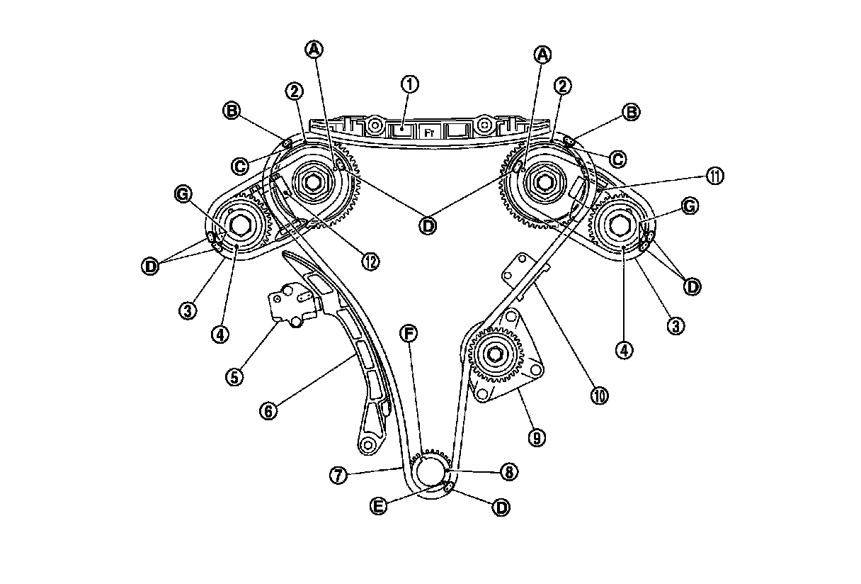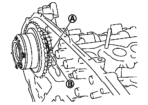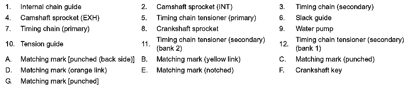 The figure below shows the relationship between the matching mark on each timing chain and that on the corresponding sprocket with the components installed.