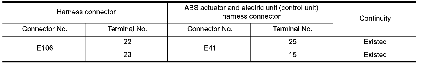 NO - Repair the main line between the harness connector E106 and the ABS actuator and electric unit