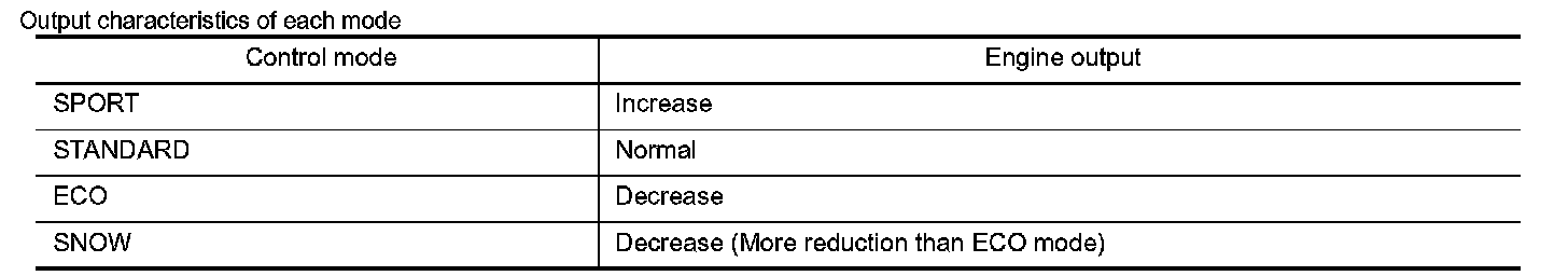 - Engine output characteristics after switching mode by operating the drive mode select switch are as follows.