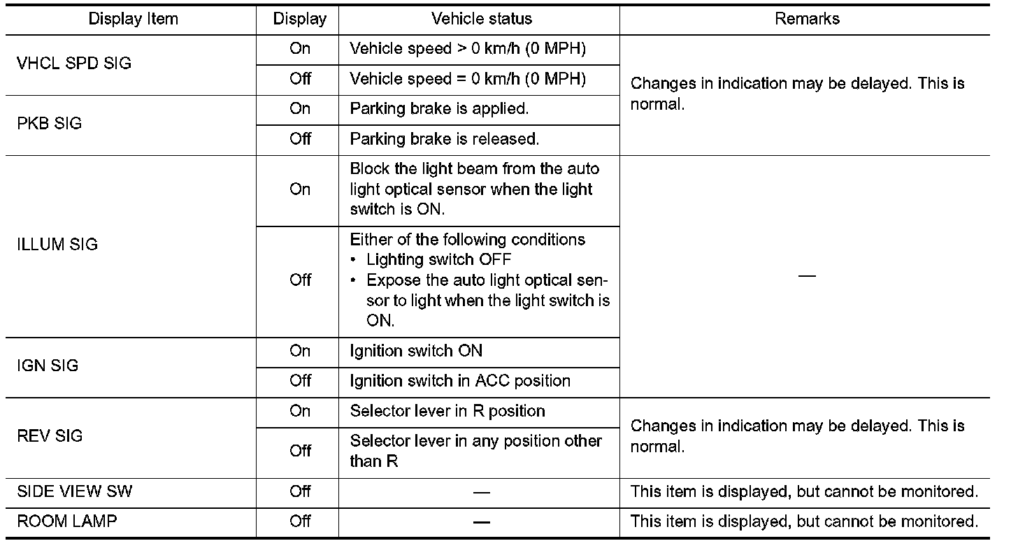 - Displays the status of the following vehicle signals inputted into the AV control unit.