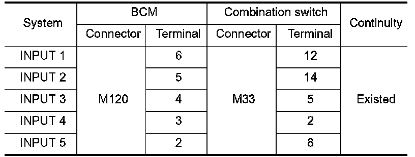 3. Check continuity between BCM harness connector and combination switch harness connector.