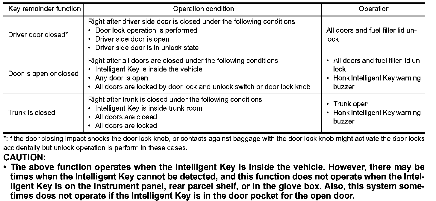 - The above function operates when the Intelligent Key is inside the vehicle. However, there may be times when the Intelligent Key cannot be detected, and this function does not operate when the Intelligent Key is on the instrument panel, rear parcel shelf, or in the glove box. Also, this system sometimes does not operate if the Intelligent Key is in the door pocket for the open door.