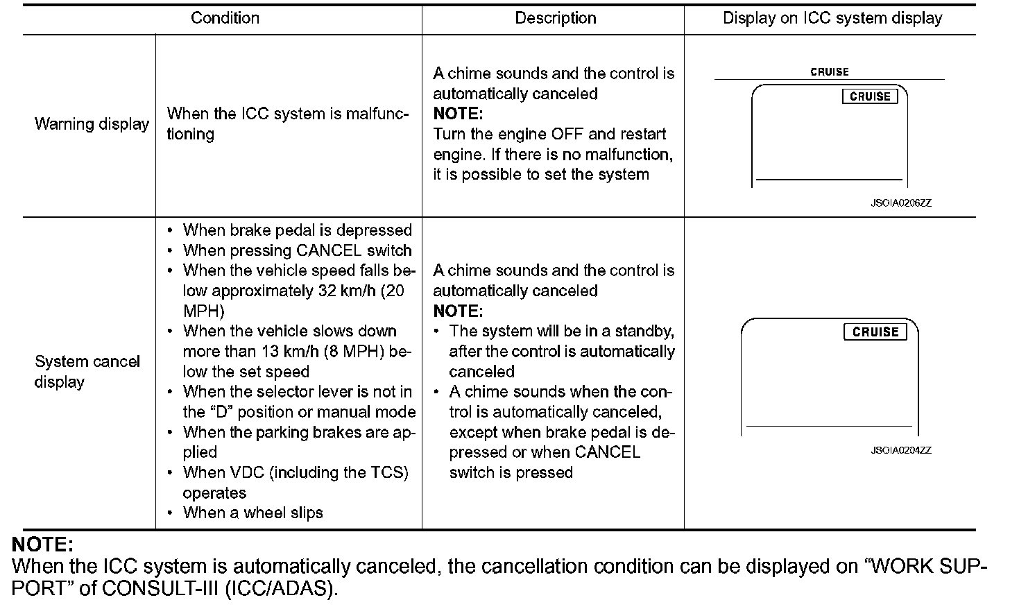 When the ICC system is automatically canceled, the cancellation condition can be displayed on "WORK SUPPORT" of CONSULT-III (ICC/ADAS).