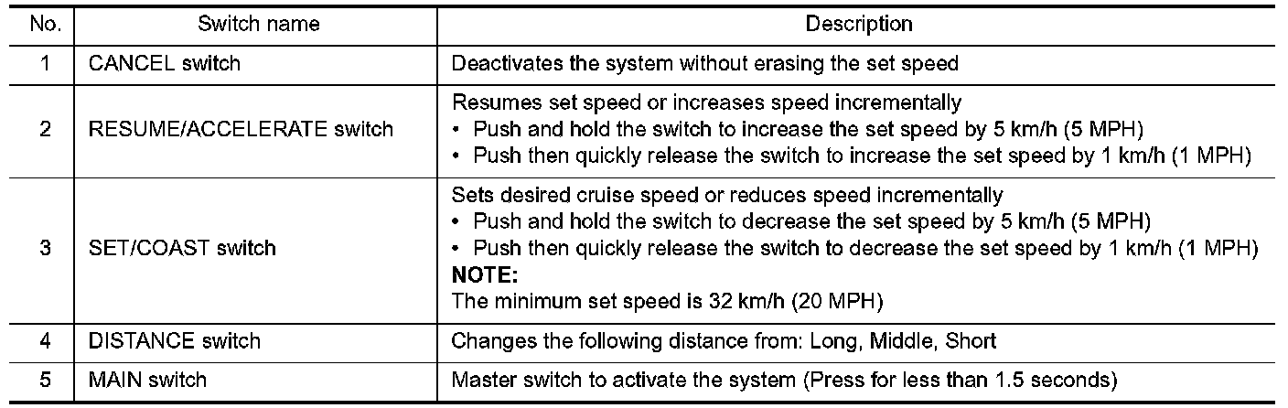 VEHICLE-TO-VEHICLE DISTANCE CONTROL MODE FUNCTION VEHICLE-TO-VEHICLE DISTANCE CONTROL MODE FUNCTION : Switch Name and Function