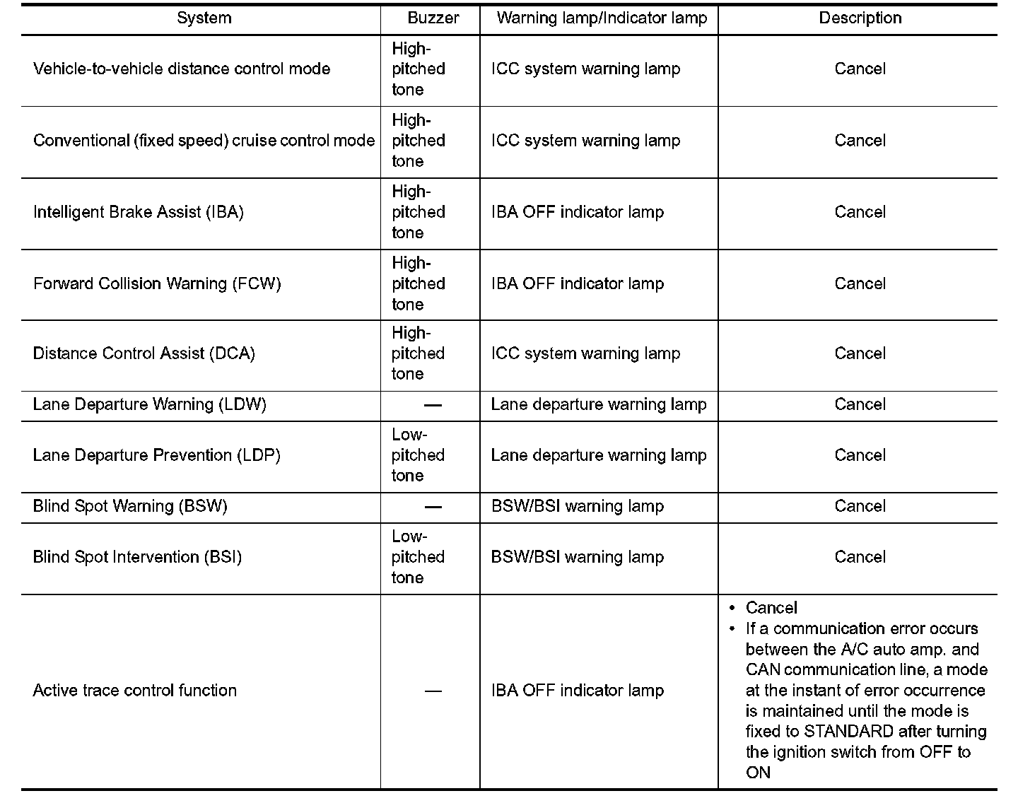 If a malfunction occurs in each system, ADAS control unit cancels each control, sounds a beep, and turns ON the warning lamp or indicator lamp.