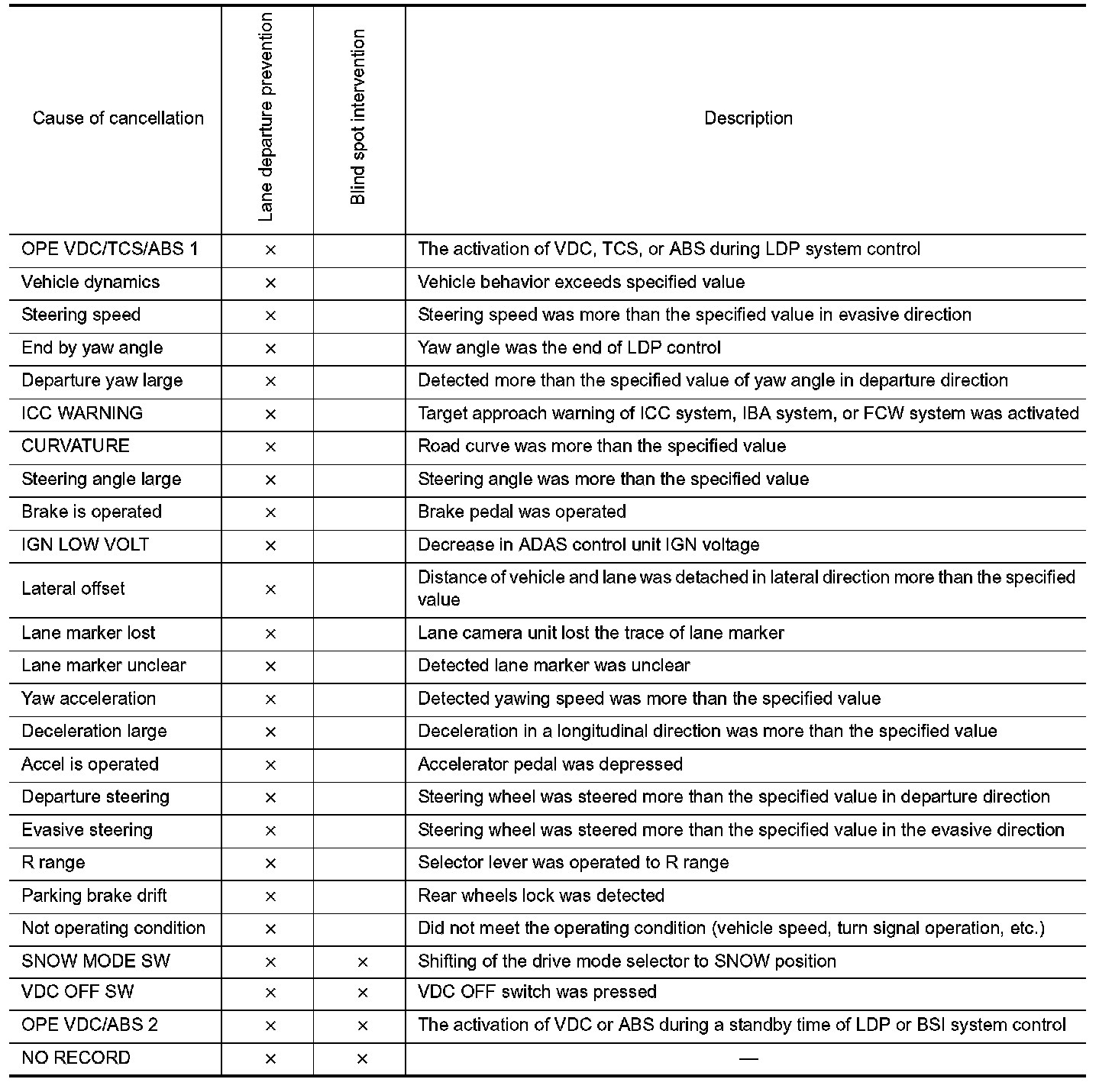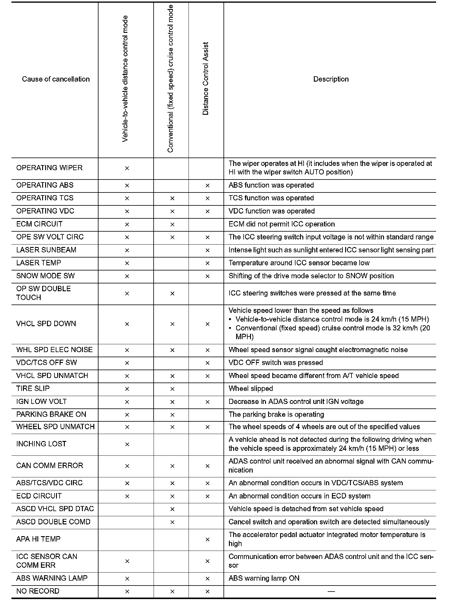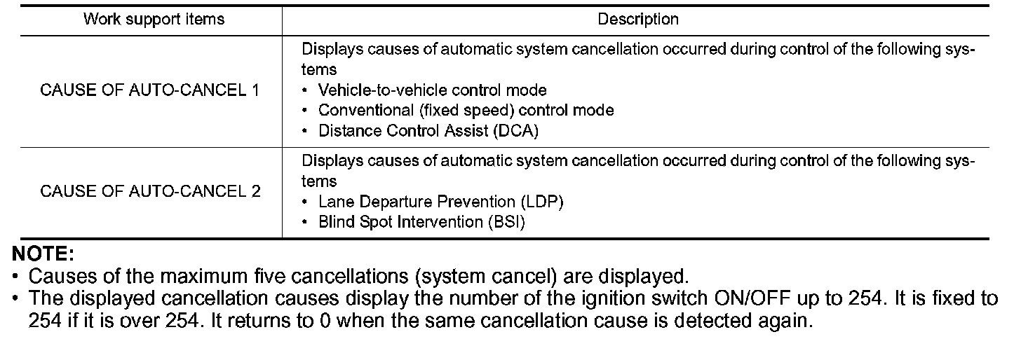 - The displayed cancellation causes display the number of the ignition switch ON/OFF up to 254. It is fixed to 254 if it is over 254. It returns to 0 when the same cancellation cause is detected again.