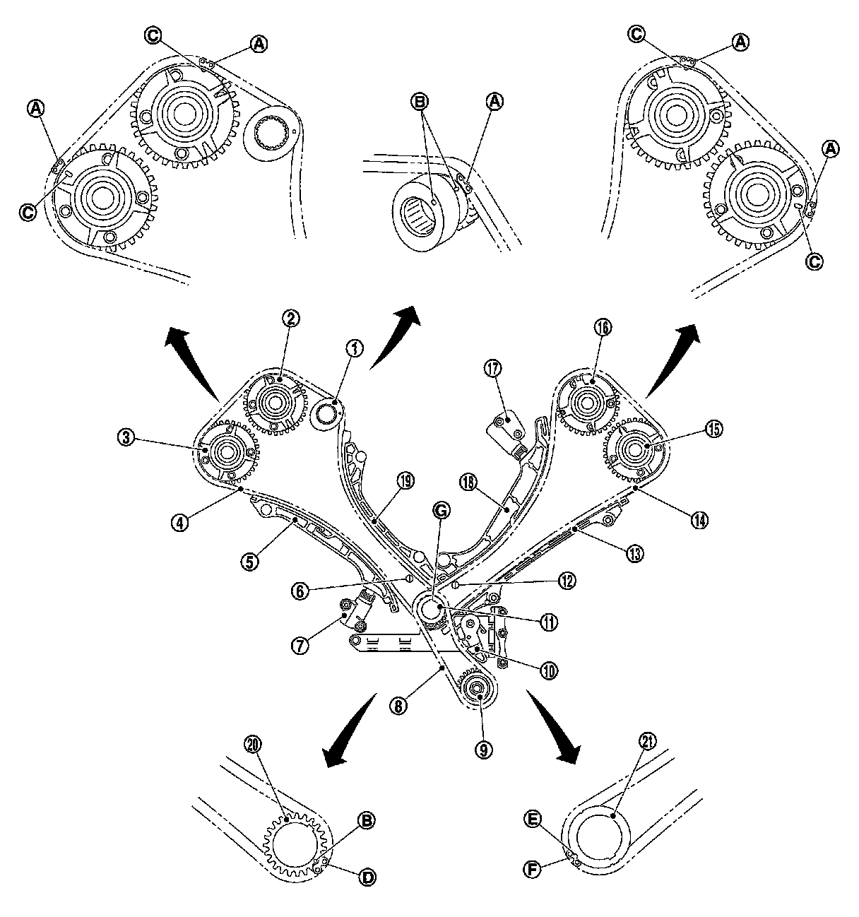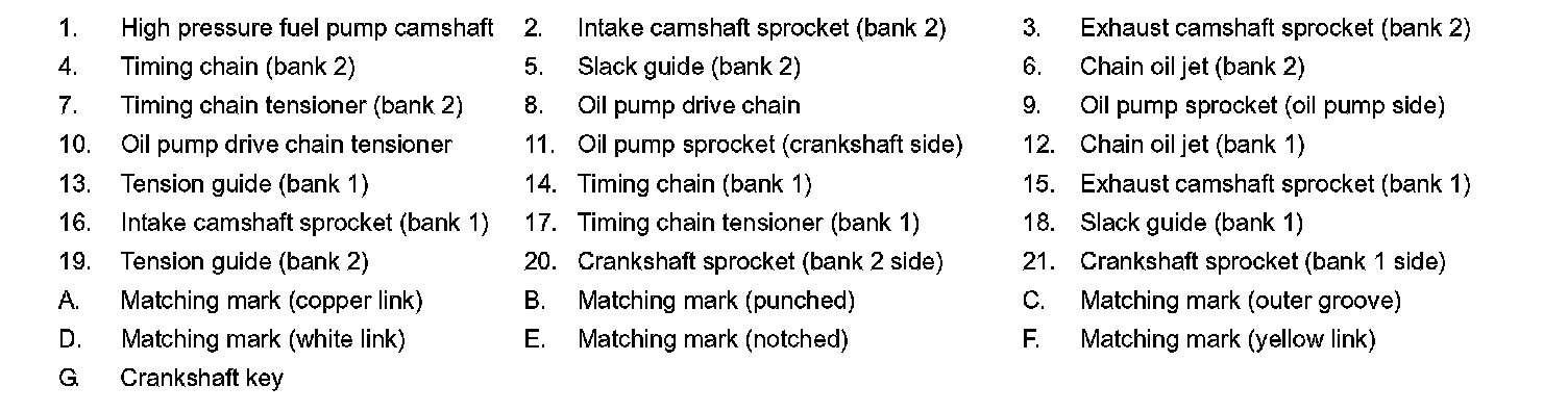 - The above figure shows the relationship between the matching mark on each timing chain and that on the corresponding sprocket, with the components installed.
