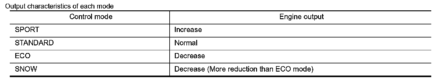 - Engine output characteristics after switching mode by operating the drive mode select switch are as follows.