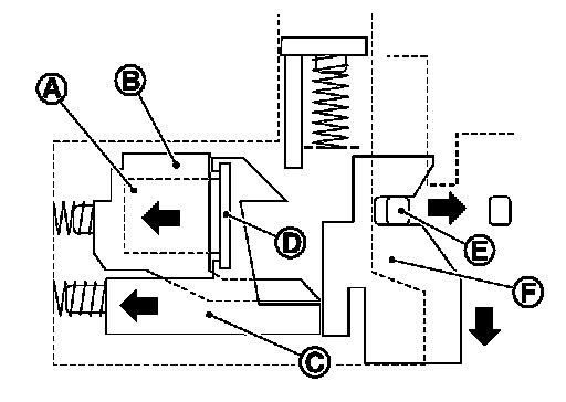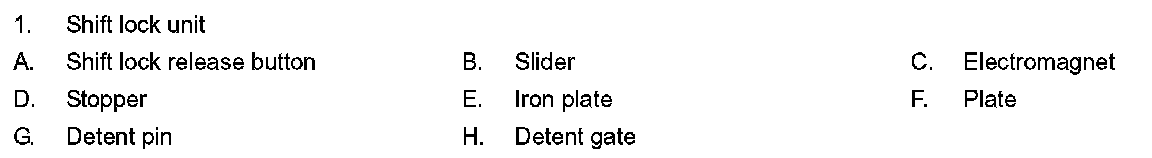 With brake pedal depressed and with ignition switch ON, electromagnet (A) of slider (B) becomes magnetized because of live electricity. stopper (C) has an iron plate (D) to unify stopper with slider when electromagnet becomes magnetized. When selector lever knob button is pressed in this situation, detent pin (E) lowers.