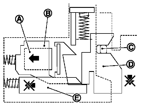 (D) also lowers while pressing slider into shift lock unit. However, stopper (E) pressed by spring comes underneath plate. Plate cannot lower further when it contacts stopper, and detent pin cannot lower to the point that releases selector lever. Thus selector lever stays in the "P" position and selector lever is unable to shift.