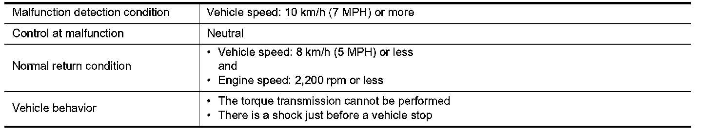 Intercepts the torque transmission and shift to the neutral status if the selector lever is shifted to "R" position while the vehicle moves forward at the vehicle speed 10 km/h (7 MPH) or more.