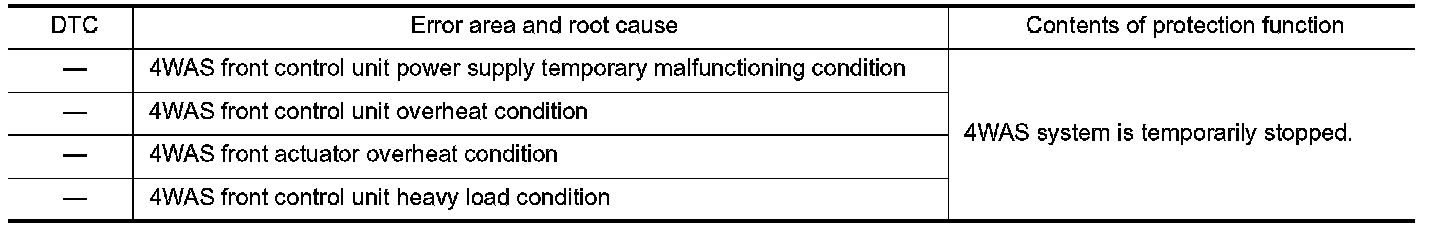 4WAS system enters in the protection function mode (4WAS system is temporarily stopped) if 4WAS system continues the heavy load condition and the overheat condition.4WAS system reactivates automatically if the heavy load condition and the overheat condition are resolved.4WAS warning lamp continues turning OFF in the protection function mode.