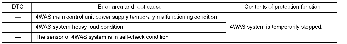 4WAS system enters in the protection function mode (4WAS system temporarily stopped) if 4WAS system continues the heavy load condition or the sensor self-check condition. (4WAS system reactivates automatically if the heavy load condition and the self-check condition are resolved.) 4WAS warning lamp stays OFF in the protection function mode.
