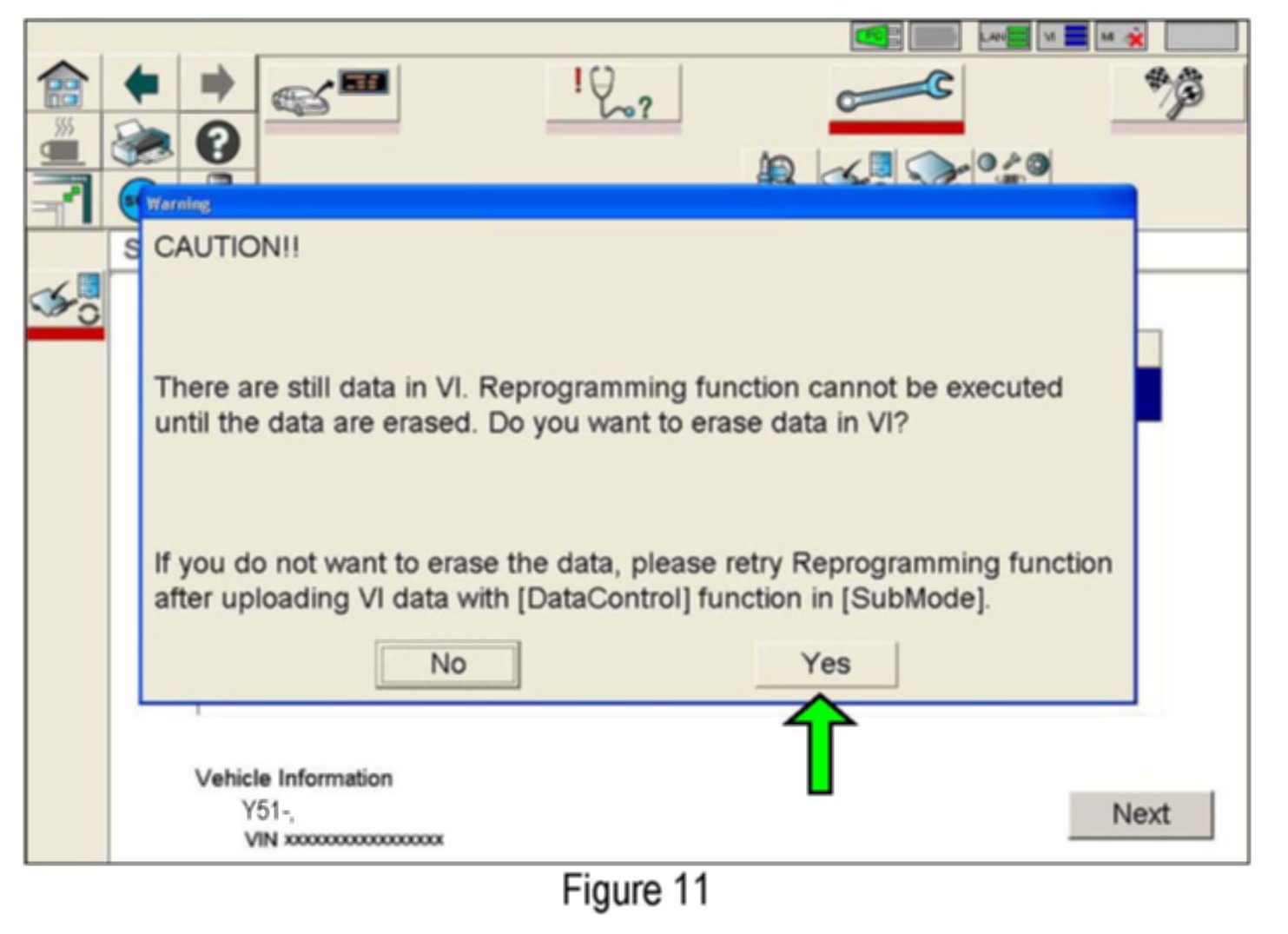 If the screen in Figure 11 appears there is data stored in the VI. Select Yes to proceed with Reprogramming.
