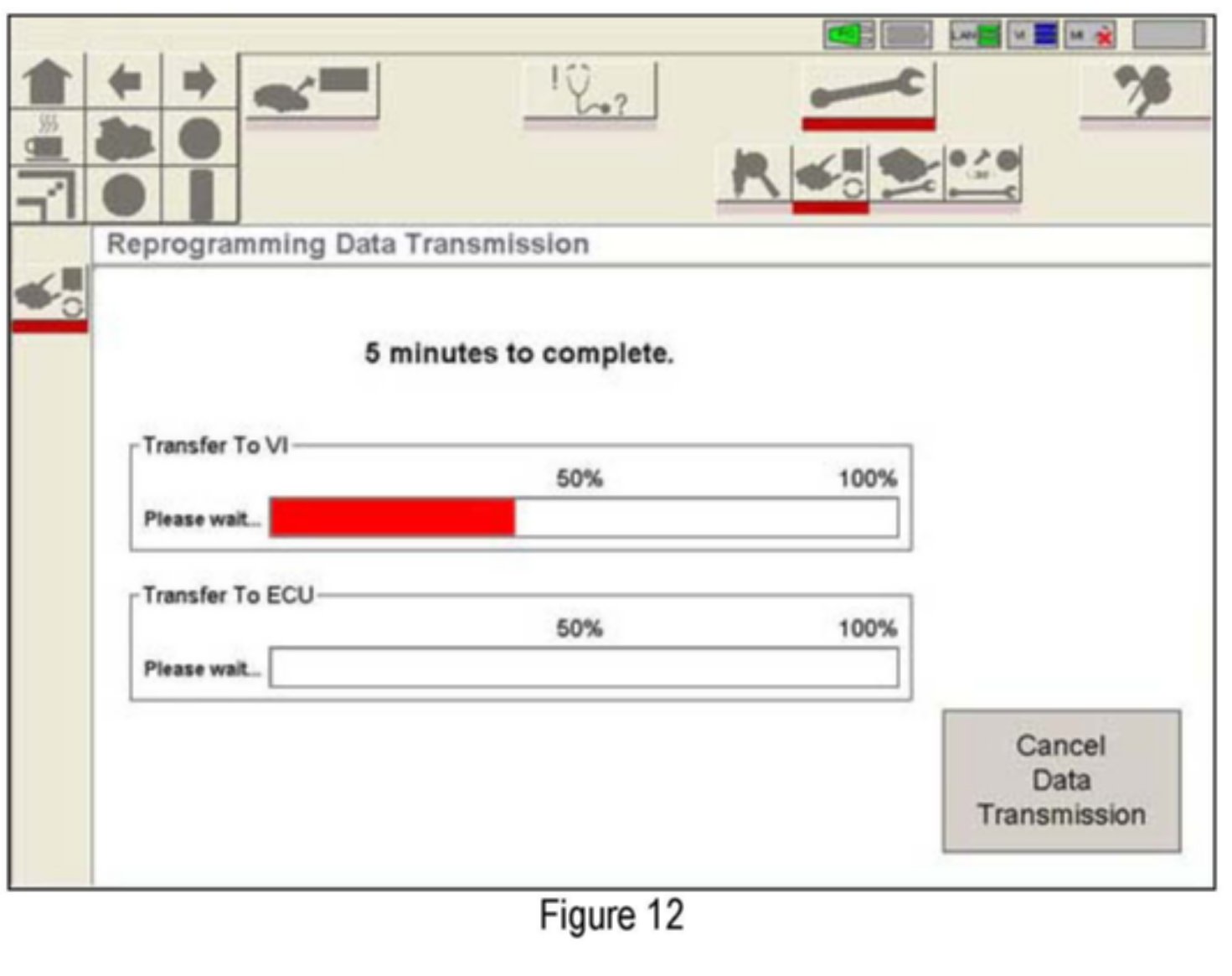 Make sure to turn OFF all vehicle electrical loads. If the vehicle battery voltage drops below 12 V before reprogramming starts, reprogramming will not complete. After the "Transfer To VI" is complete, the reprogramming will stop, and "Transfer To ECU" will not start.